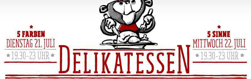 Nehmen Sie eine formschöne Rauminstallation, eine frisch dekorierte Tafel mit handverziertem Porzellan und füllen Sie das Ganze mit hungrigen Besuchern. Erleben Sie einen Schweizer Spitzenkoch, der sein Handwerk perfekt beherrscht. Geben Sie allmählich Musik dazu. Schälen Sie ein Klavier und rühren Sie langsam Mundart darunter. Würzen Sie mit gepfefferten Texten und schmecken Sie das Ganze mit Live-Video ab. Lassen Sie diese Komposition Sechs-Gänge lang ziehen. Reichen Sie dazu attraktives Servicepersonal und guten Wein. Verdauen Sie das erst einmal in aller Ruhe.